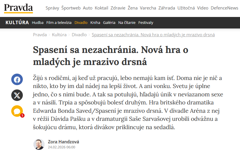 The play Saved by British playwright Edward Bond is chillingly raw. At Divadlo Aréna, director Dávid Paška and dramaturg Saša Sarvašová have turned it into a bold and shocking drama that pins the audience to their seats.