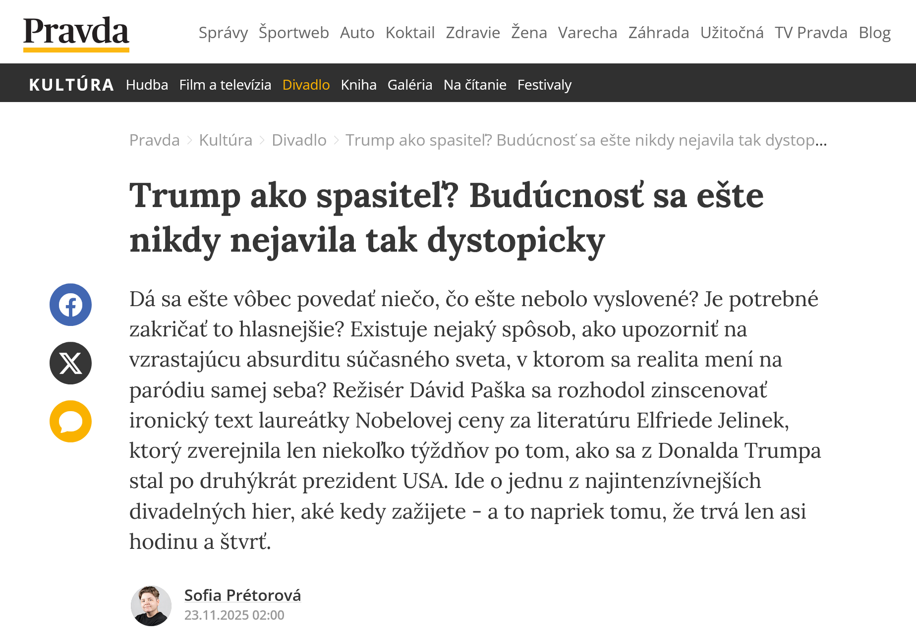 Dá sa ešte vôbec povedať niečo, čo ešte nebolo vyslovené? Je potrebné zakričať to hlasnejšie? Existuje nejaký spôsob, ako upozorniť na vzrastajúcu absurditu súčasného sveta, v ktorom sa realita mení na paródiu samej seba? Režisér Dávid Paška sa rozhodol zinscenovať ironický text laureátky Nobelovej ceny za literatúru Elfriede Jelinek, ktorý zverejnila len niekoľko týždňov po tom, ako sa z Donalda Trumpa stal po druhýkrát prezident USA. Ide o jednu z najintenzívnejších divadelných hier, aké kedy zažijete - a to napriek tomu, že trvá len asi hodinu a štvrť.